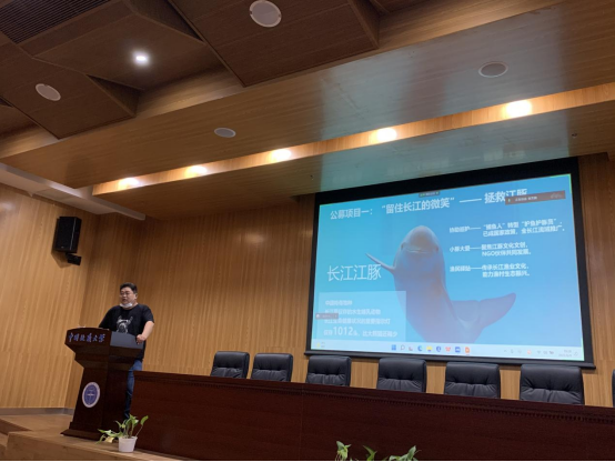本次讲座共分为三个主要板块:背景引入、案例分享、影响剖析。首先,钱博士以名词概念解释为切入点,介绍了各类组织模式及生态文明保护相关概念,在此他与同学们积极互动,提出了第一个互动问题:你对长江大保护的理解是什么?以问题为导向,同学们更易理解钱博士所讲解到的湖北省长江生态保护基金会(简称“CCF”)的工作目标与使命,CCF是以拯救长江江豚、青头潜鸭等旗舰物种为核心长江大保护工作的地方性环保非公募基金会,其项目对标SDGs指标,在探索长江生态保护和可持续发展上做出了巨大贡献。