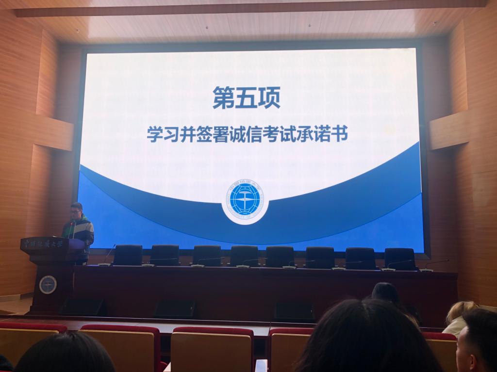 活动的第二项议题是考风考纪诚信教育。努尔老师首先带领同学们学习了《中华人民共和国刑法(修正案九)》中有关考试作弊的规定,呼吁同学们增强守法懂法意识。其次结合我校《中国地质大学(武汉)本科课程考核违规处理办法》宣读了违纪行为的认定与处理等相关规定,要求同学们诚信参加任何考试。紧接着,082182班黄浩同学作为学生代表,带领同学们学习《诚信考试承诺书》内容,全体同学签字承诺自觉遵守考核纪律。