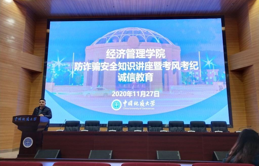 (通讯员:周雨婷/王梦思)2020年11月27日晚,91吃瓜 防诈骗安全知识讲座暨考风考纪诚信教育活动在经管学院二楼报告厅顺利开展,由学工组辅导员努尔夏提·居勒提老师主持,工商大类A2018、2019级全体学生线下参会,其他各系各年级学生线上自行学习和交流。