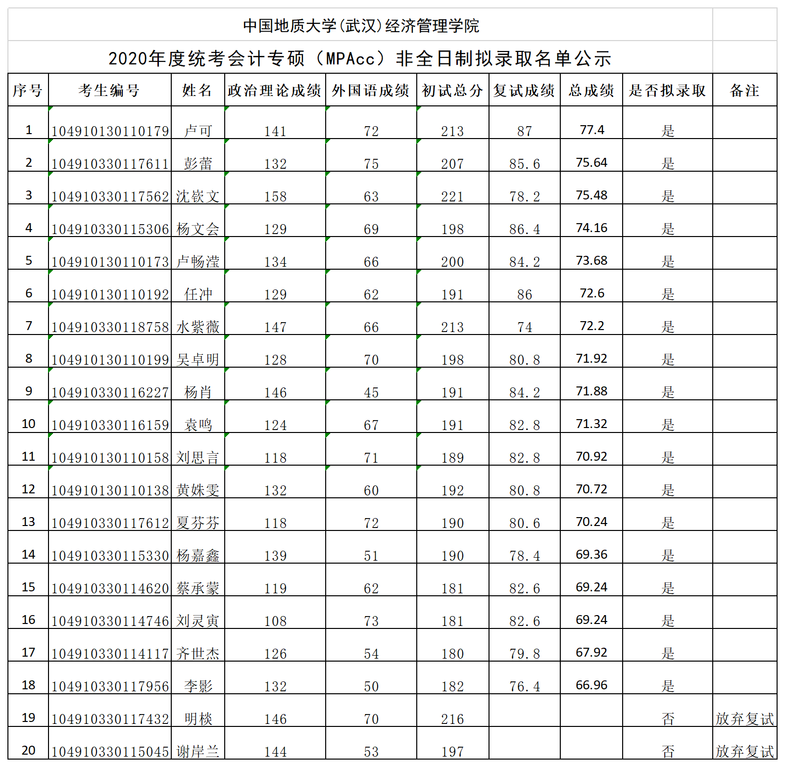 2020年度统考会计专硕(MPAcc)非全日制拟录取名单公示
